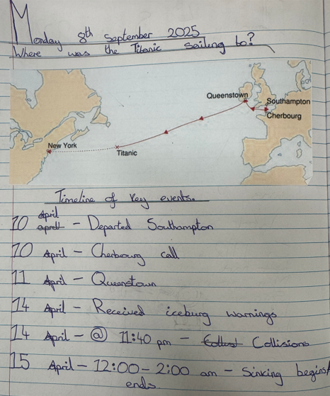 We started our whole-school Titanic project by looking at what life was like in 1912. The children then participated in a clue hunt to uncover what 'moment in time' we would be learning about. We investigated key dates in the Titanic timeline and mapped out the route it took.