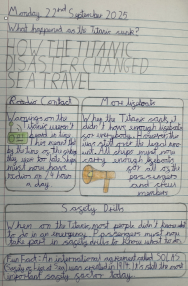 The children then enjoyed creating posters to show what we have learnt from the Titanic and how it is still relevant today.